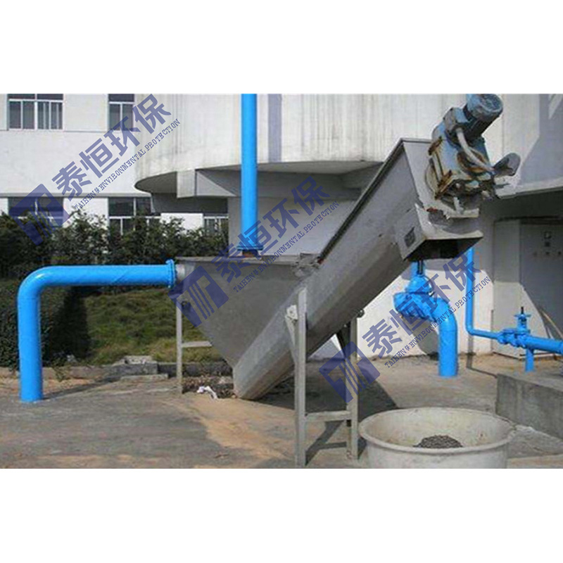 泰恒機械所研發的這款設備,其砂水混合物從頂部的法蘭接管進入儲液箱內,箱內專門設計的散水盤使水匯集于下水槽;砂水混合液中,砂石逐漸沉淀于下部的螺旋u型槽內,空心螺旋緩慢旋轉將砂礫推向上出口,自然脫水排除。
